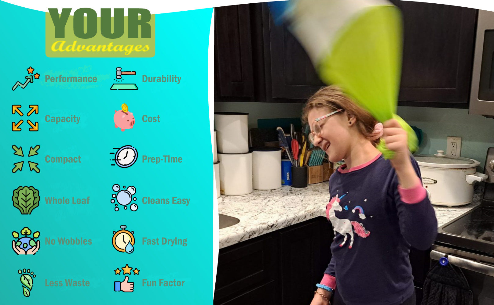 • ✅HIGH PERFORMANCE - Enjoy Clean Dry Crisp Salads & Herbs: We tested Saladzilla against other leading brands. The results were equal or better in drying performance. No need to lift it out of a cabinet or assemble & disassemble before & after usage. Pop it open and start using it right away. Never compromise performance for convenience. Try it for yourself